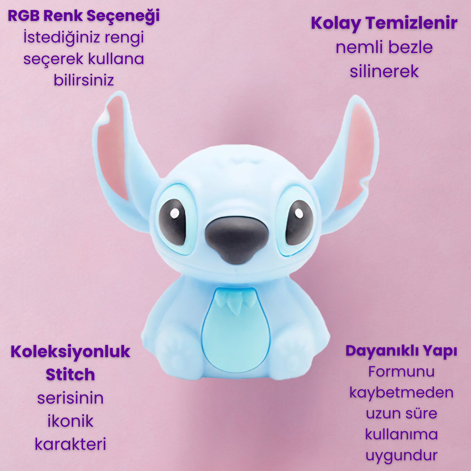 Geceleri odanıza huzur katmak hiç bu kadar sevimli olmamıştı LumiStitch™ dört farklı ışık modu sayesinde dilediğiniz atmosferi kolayca yakalamanızı sağlar göz yormayan beyaz ışığı okumalarınızda aydınlık bir ortam sunarken mavi ton sakinleştirici etkisiyle uykuya geçişi kolaylaştırır daha sıcak bir enerji için kırmızı ışık dinginliğin yanında yumuşak bir sıcaklık verir yeşil ışık ise doğadan gelen ferahlığı odaya taşır